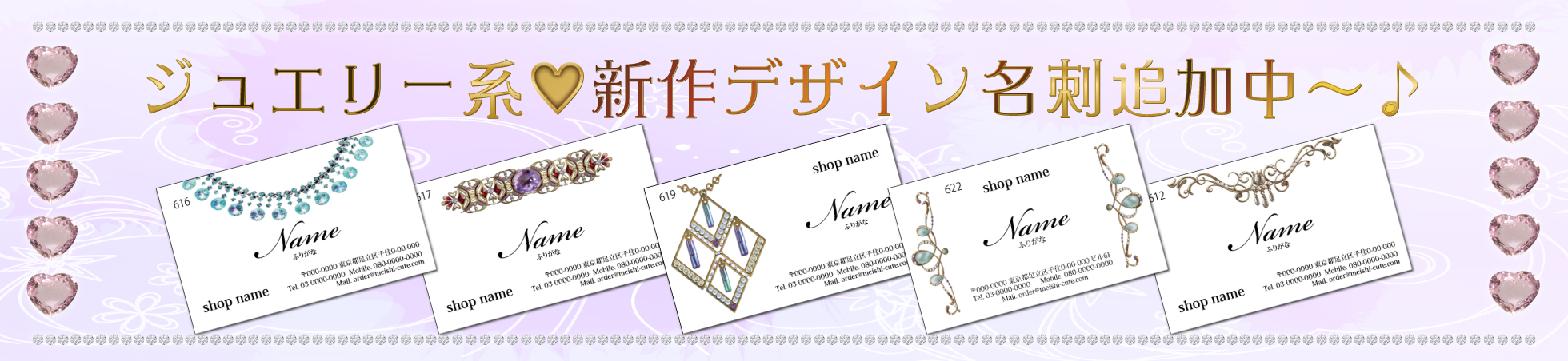 名刺キュートでは、可愛デザイン、おしゃれなデザイン、かっこいいデザイン、などなどもりだくさんのデザインをご用意させていただいております。当店のご愛用実績として、ネイリスト,キャバクラ嬢,セラピスト,モデル,ママ,コンパニオン,美容師,エステシャン,インストラクター,占い師,セラピスト,メイド,アイドル,ヒーラー,メイクサロン,ラウンジ,ガールズバー,スナック,パブ,クラブ,キャスト,バーテンダー,エステサロン,ネイルサロン,雑貨屋,病院,フラワーショップ様などなどたくさんの方々やお店でお名刺、ショップカード、スタンプカード、空名刺(から名刺)としてご愛用いただいております!